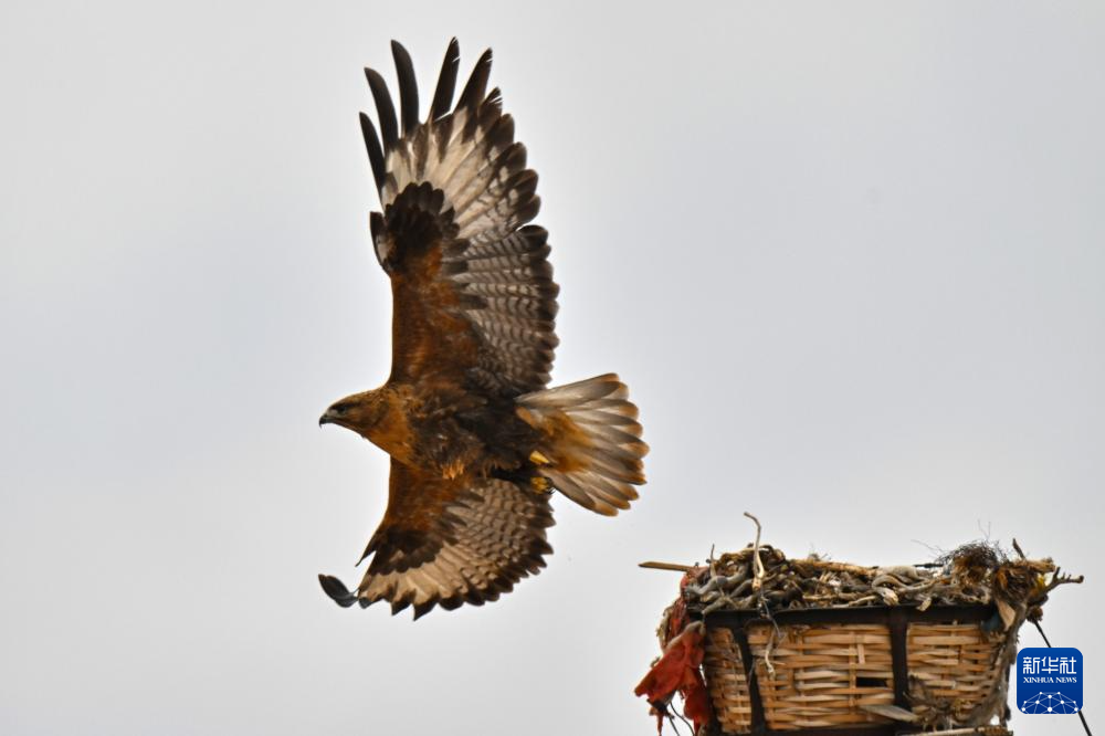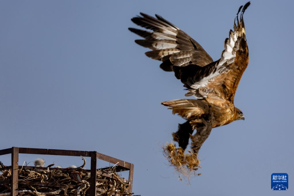 羌塘草原上的一只大鵟飞离鹰架上的巢(6月8日摄)。新华社记者 孙瑞博 摄