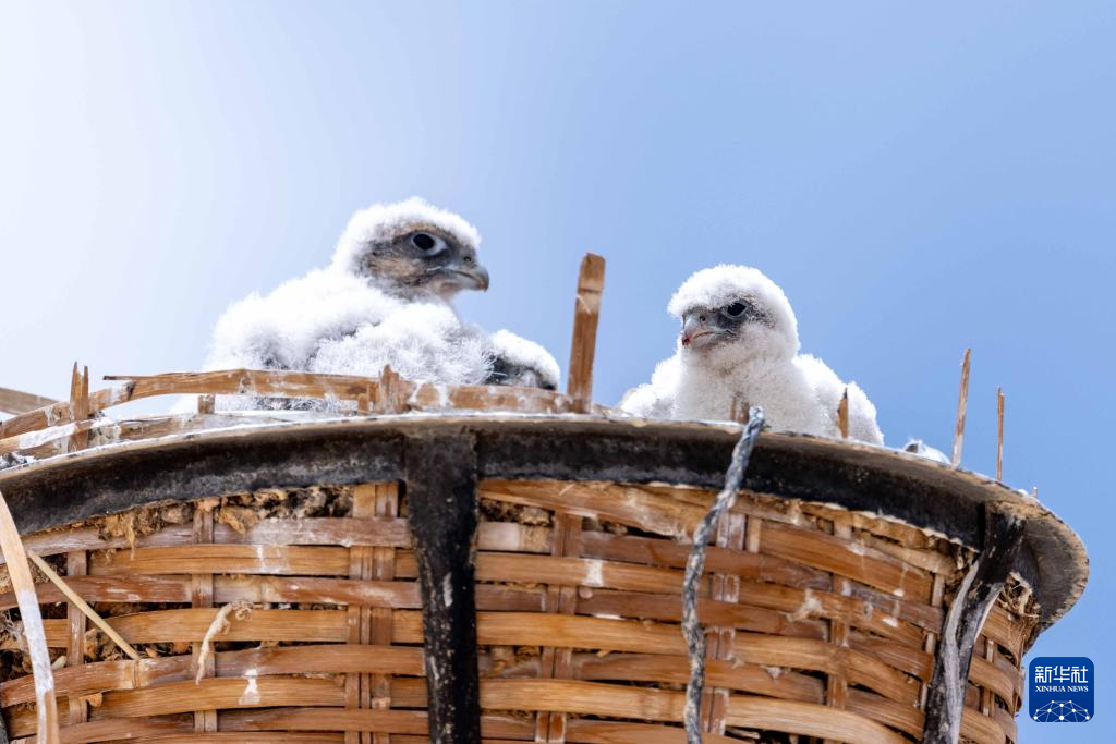 6月7日拍摄的在鹰架上巢中栖息的游隼雏鸟。新华社记者 旦增尼玛曲珠 摄