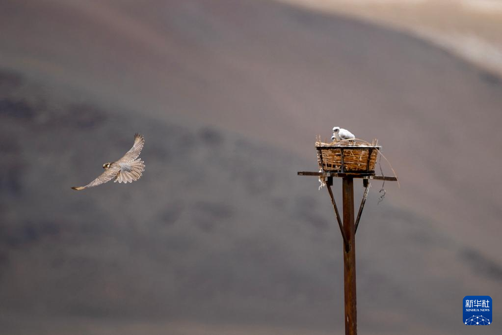 在羌塘草原, 一只游隼飞离鹰架上的巢(6月7日摄)。新华社记者 姜帆 摄
