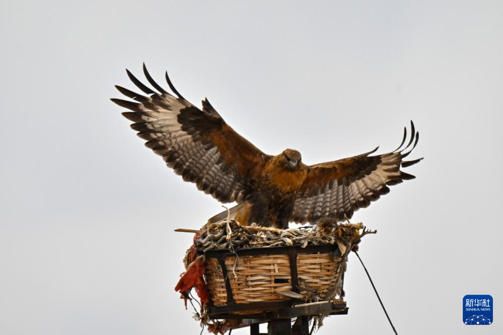 羌塘草原上的一只大鵟飞回鹰架上的巢(6月7日摄)。新华社记者 孙瑞博 摄