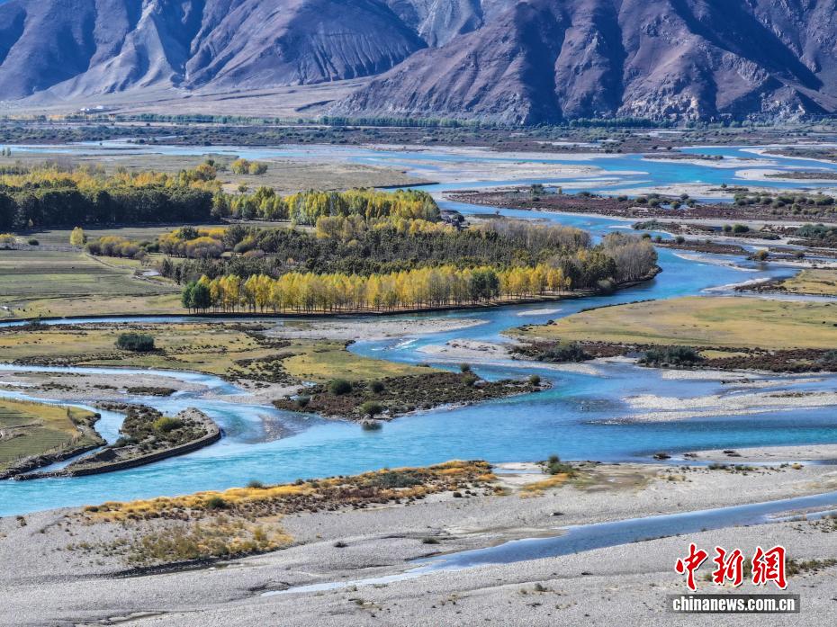 10月15日,西藏自治区拉萨市墨竹工卡县境内的拉萨河两岸进入最美秋季,澄澈河水映衬着蓝天白云,沿线村庄与拉萨至林芝高等级公路相映成趣,美景如画。(无人机照片)中新社记者 贡嘎来松 摄