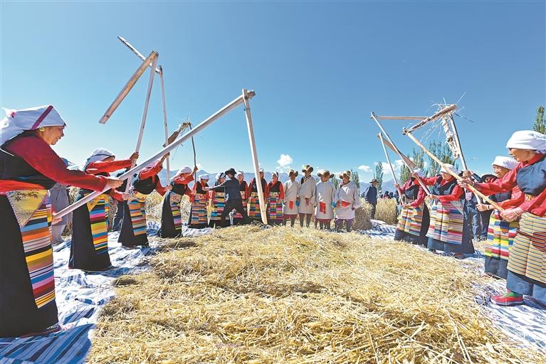 图为深秋时节,在拉萨市林周县强嘎乡典冲村,当地农民用传统方式打场(资料图片)。记者 王敏 摄
