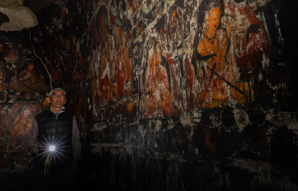 强巴次仁倚着洞口,听着仁增旺扎的讲解,眯着眼望向那些画。他看不太清壁画的细节了,但半辈子的守护,已让壁画像是他生活的一部分——也是他所理解世界的一部分。