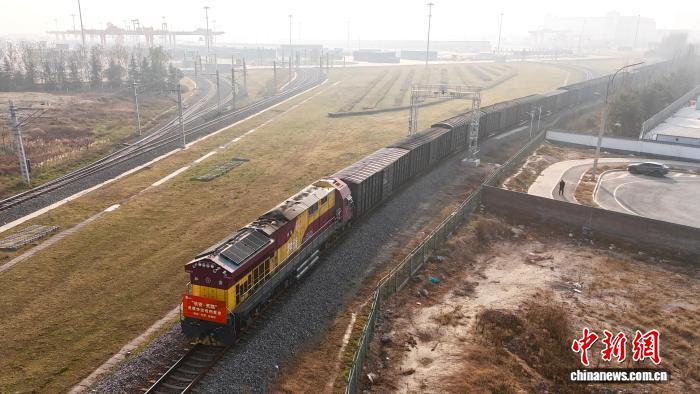12月11日,陕西西安,满载30车食品、日用品、建筑材料等货物的X385次“长安·天路”进藏班列从西安国际港站出发,一路向西开往西藏拉萨、日喀则。自去年10月21日陕西首开进藏快速城际班列以来,已累计开行163列。在X385进藏班列稳定运行一年多的基础上,西安铁路局于当日正式发布该品牌并命名为“长安·天路”进藏班列,着力打造西安至拉萨、日喀则城市间“点到点”“公转铁”快运班列。图为班列整装待发。中新社记者 张远 摄