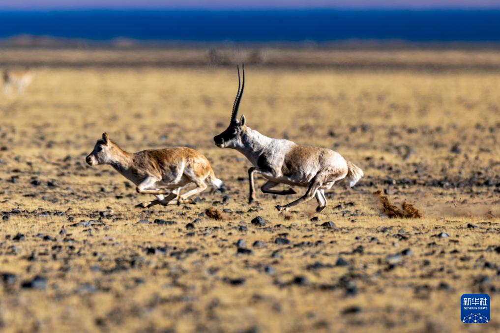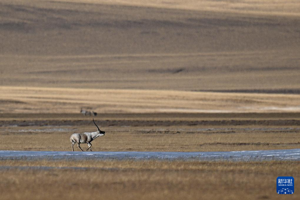 一头雄性藏羚羊在羌塘国家级自然保护区的草原上追逐雌性藏羚羊(12月1日摄)。新华社记者 郭昱 摄