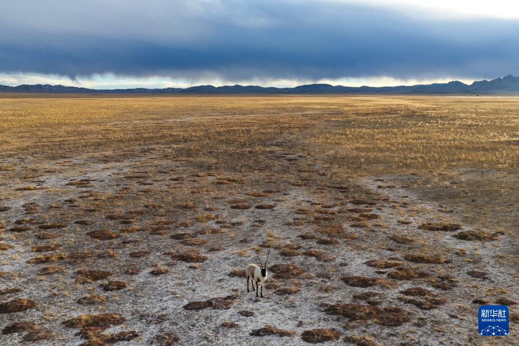 在阿尔金山国家级自然保护区,一只雄性藏羚羊在觅食(12月5日摄,无人机照片)。新华社记者 辛悦卫 摄