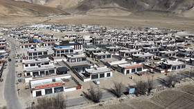 1月5日,在定日县长所乡森嘎村村史馆前的广场上,小朋友背着妹妹玩耍。新华社记者 姜帆 摄