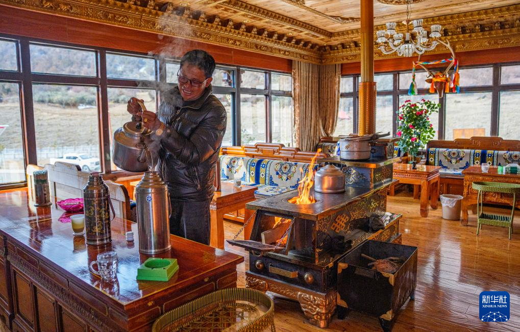 2月5日,玉麦乡村民旺庆在自家经营的民宿里灌开水。新华社记者 丁增尼达 摄