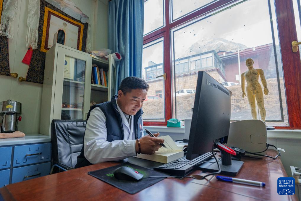 2月5日,玉麦乡卫生院医生次旦米久在办公室研读藏医书籍。新华社记者 丁增尼达 摄