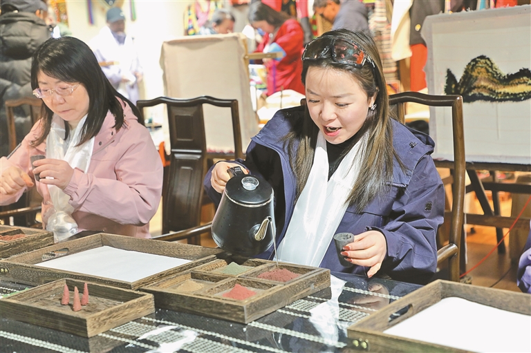 游客们走进雍布拉康与昌珠寺,探寻西藏第一座宫殿的深厚历史底蕴,欣赏巧夺天工的藏式建筑艺术。在“雅砻里”文化艺术街区非遗展馆,传统编织、唐卡绘画、藏文书法、民族服饰等非遗技艺与文创精品集中亮相,吸引了众多游客驻足体验。