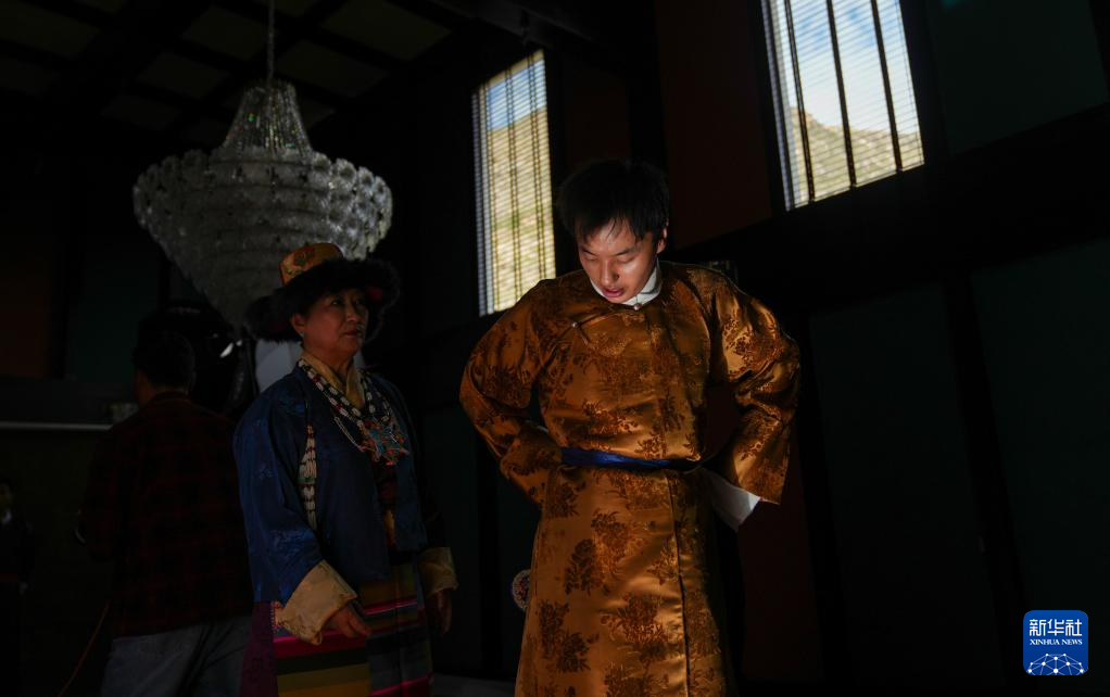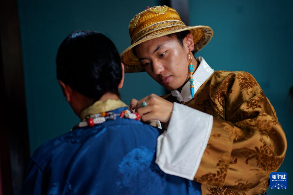 班珠丹塔为模特调整藏装配饰(9月9日摄)。新华社记者 张笑宇 摄