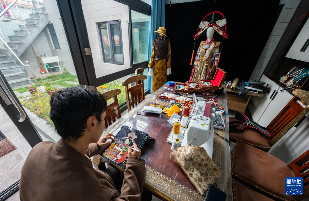 班珠丹塔在家中工作室设计藏装(9月11日摄)。新华社记者 丁增尼达 摄