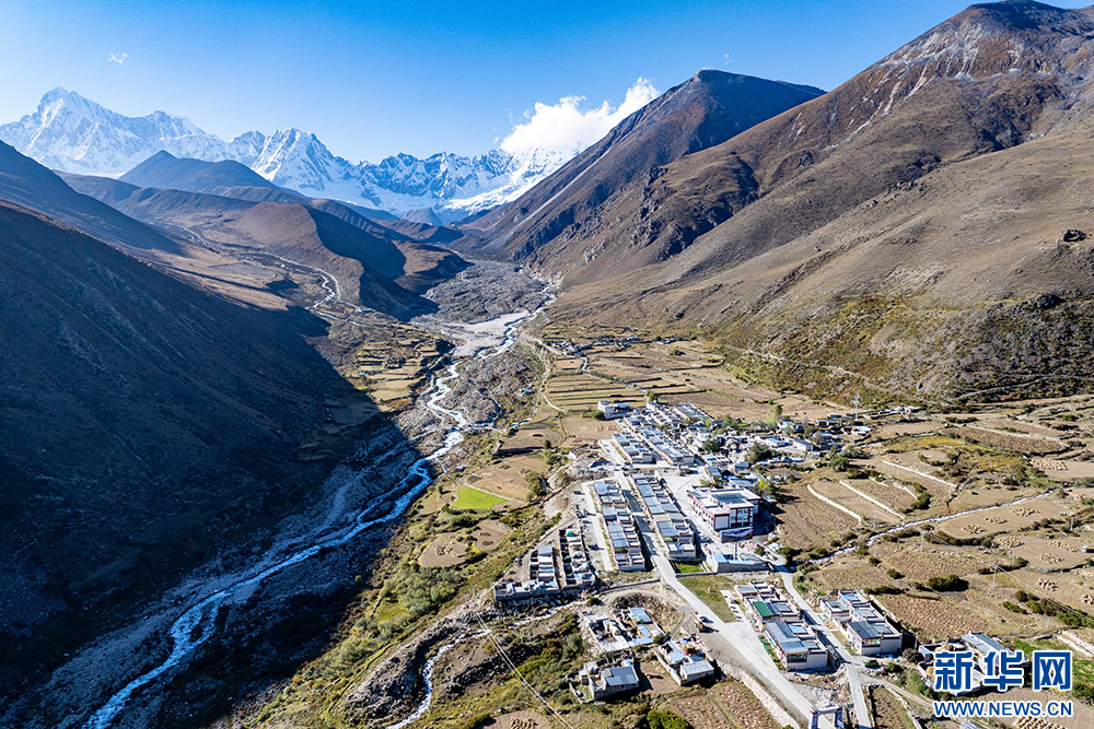 10月11日拍摄的远处库拉岗日雪山与西藏山南市洛扎县措玉村(无人机照片)。新华网 旦增努布 摄