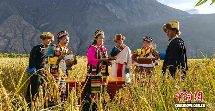 图为共康村村民举行水稻收割前的庆祝仪式。赵延 摄