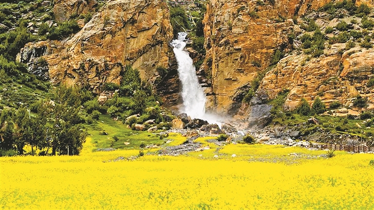 昌都市边坝县三色湖畔飞流的瀑布。记者 丹增群培 摄