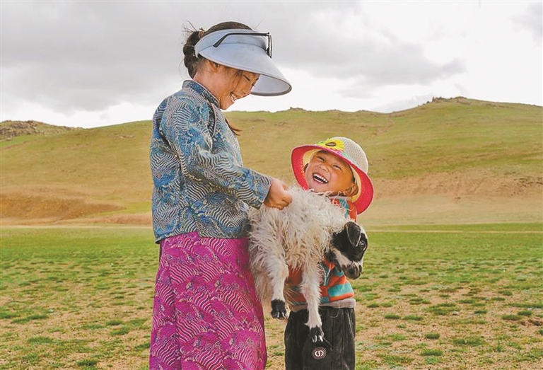 羌塘草原上,牧民和孩子与羊羔亲密互动。记者 丹增群培 摄