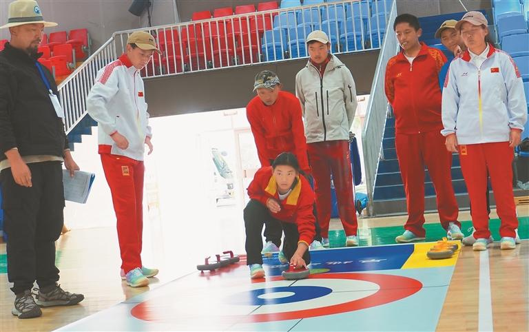 图为运动员在进行旱地冰壶比赛。记者 明吉 摄