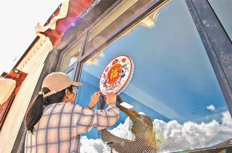 定结县郭加乡乃村重建点,群众正在为新家贴福字。记者 旦增嘎瓦 摄