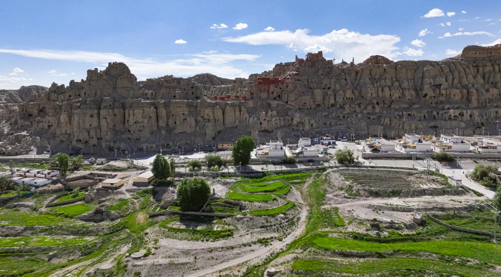 皮央石窟群与山下的村庄相互映衬(无人机照片)。新华社记者 丁增尼达 摄