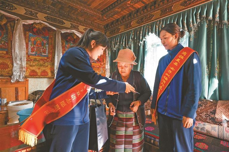 图为岗拉美朵女子双语志愿服务队开展“敲门入户”行动,向居民细致讲解家庭用火、用电、用气安全须知,传授初起火灾扑救技巧及火场自救逃生方法。仓琼 通讯员 孙成仲 摄