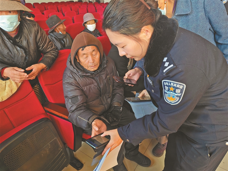 图为民警在指导村民下载安装“国家反诈中心”APP。记者 卢文静 摄