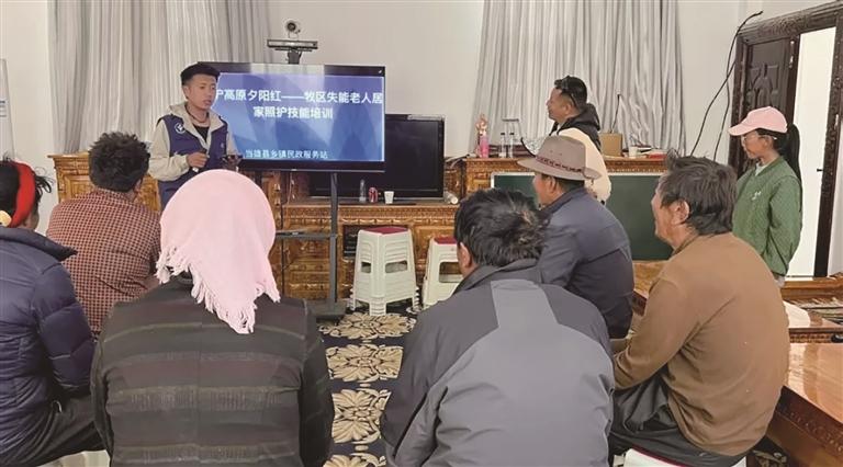 当雄县民政局乡镇民政服务站开展牧区失能老年人居家照护技能培训。图由拉萨市强泽社会工作服务协会提供