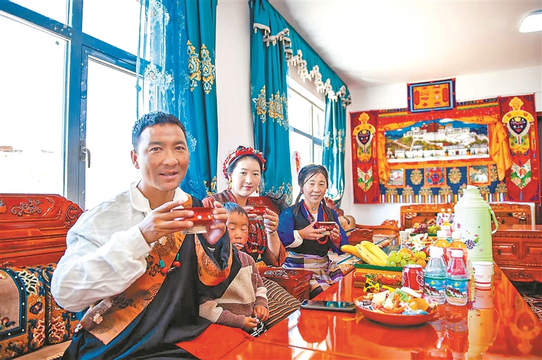 图为定结县乃村村民在喝新房里的第一杯酥油茶。本报记者 旦增嘎瓦 摄