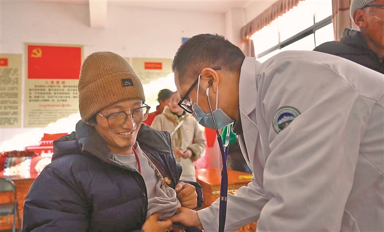 图为援藏医疗专家为群众听诊。记者 万靖 摄