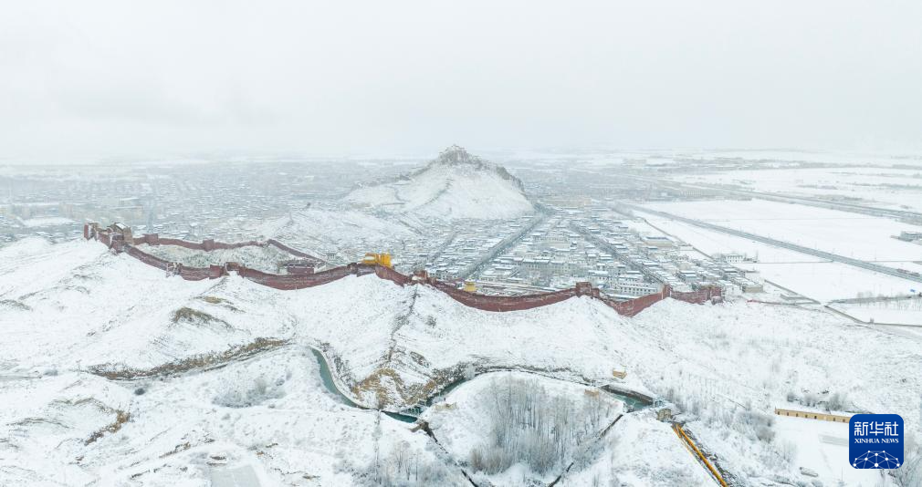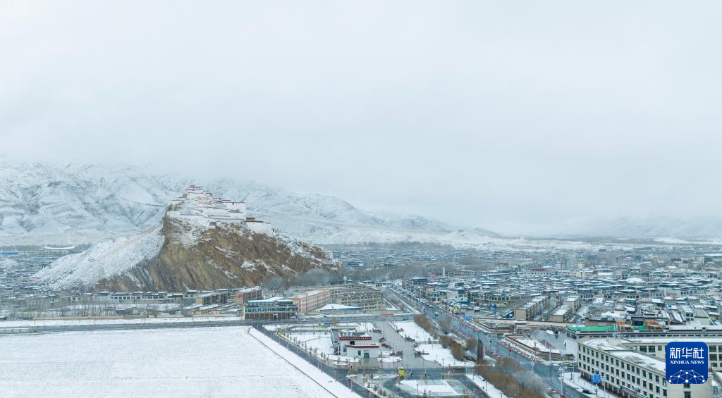 3月13日,空中俯瞰雪后的西藏日喀则市江孜县江孜宗山古堡(无人机照片)。新华社记者 晋美多吉 摄