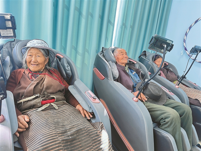 图为琼结县下水乡措杰村的老人们在智慧居家服务驿站康养区按摩椅上按摩。记者 巴桑旺姆 摄