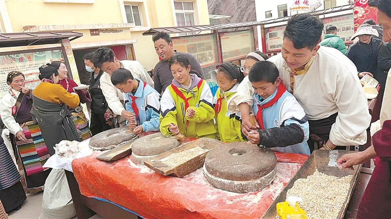 图为学生在体验磨糌粑。记者 平措郎加 摄