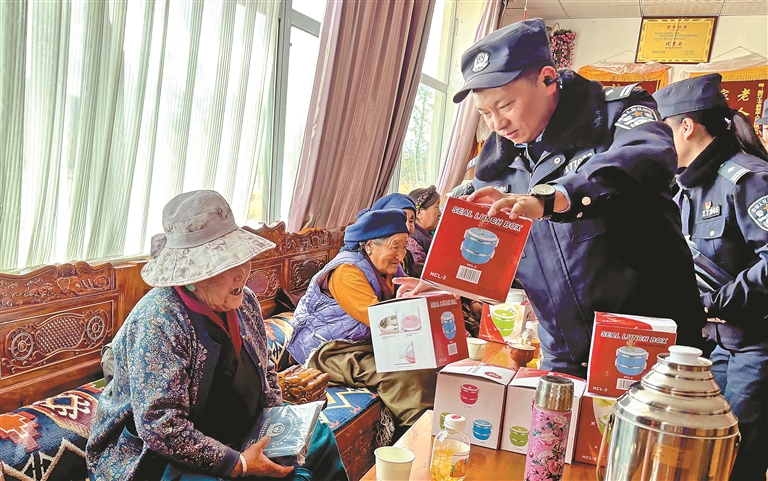 墨竹工卡县公安局治安大队民警向老人宣传网络反诈、居家安全等常识。记者 格桑伦珠 摄