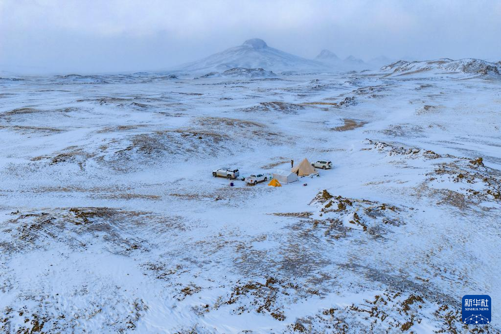 4月11日,羌塘国家级自然保护区那曲地区管理局专业管护队在“巴毛穷宗”地区雪中宿营(无人机照片)。新华社记者 姜帆 摄