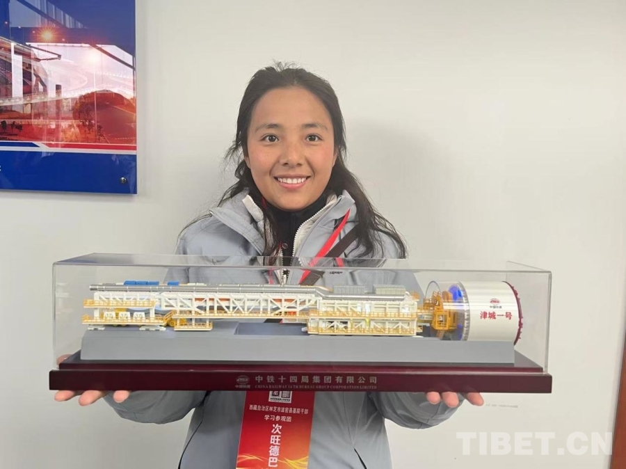 图为西藏基层干部学习参观团领队次旺德巴展示“津城一号”盾构机模型 摄影:王茜