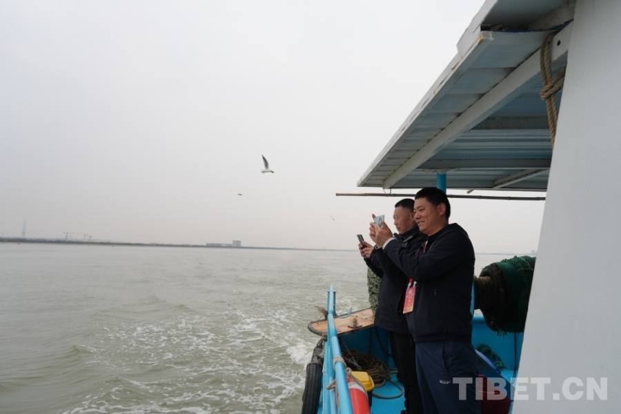 图为西藏基层干部学习参观团成员在船上拍摄海景 摄影:王茜