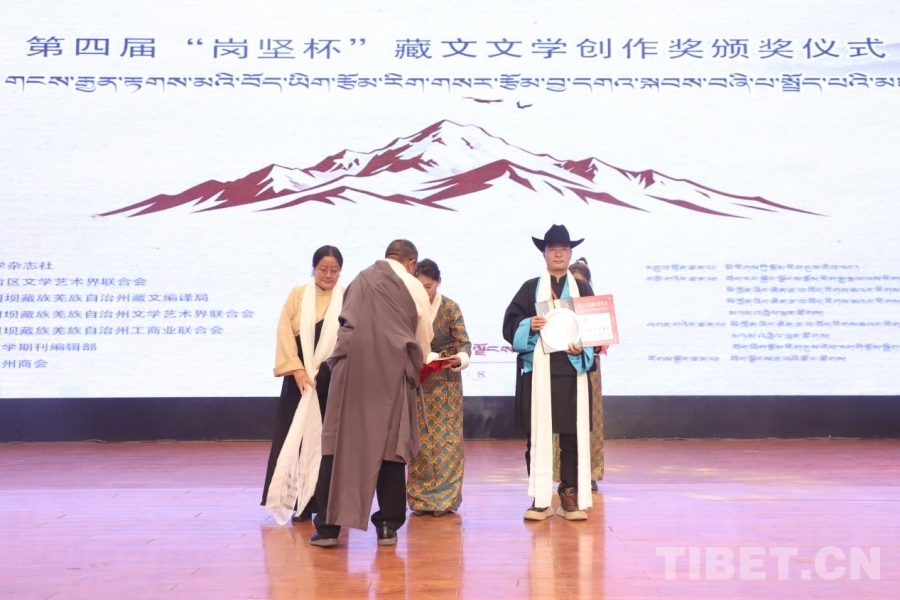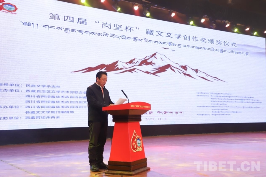 中国西藏网讯 11月8日,第四届“岗坚杯”藏文文学创作奖颁奖仪式在拉萨举行。来自北京、四川、青海、西藏等地的文学界代表、获奖作者、藏文文学期刊主编及读者代表齐聚一堂,共赴这场植根民族传统、彰显时代精神的文化之约,奏响新时代藏文文学守正创新的昂扬旋律。