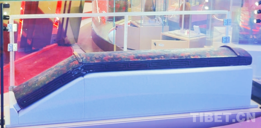 我们看到,虽然历经千年,琴与长鼓仍色泽鲜艳,保存完好。整体呈亚腰形,两端配备皮带,可系于腰间,长鼓中间最细窄之处可系绳便于安置在乐器架上。其表面精巧地髹饰着朱漆与黑漆,巧妙地描绘出宝相牡丹花、云头纹和火焰纹。而拥有同样花纹的木琴一端斜下折出钝角,更见巧思。虽然木琴两道岳山间原本的琴弦因年代久远没有了,但我们仍仿佛能想象到,入藏后的演奏中,琴弦声声,有长安的温婉绵长,也含雪域的雄浑辽阔,鼓声阵阵,中原的节奏与雪域的韵律交织,和鸣穿越时空,在当下奏出和谐乐章。这两件公主的嫁妆,早已不是单纯的器物,更承载着深厚的历史文化底蕴,成为民族文化交融的鲜活注脚。