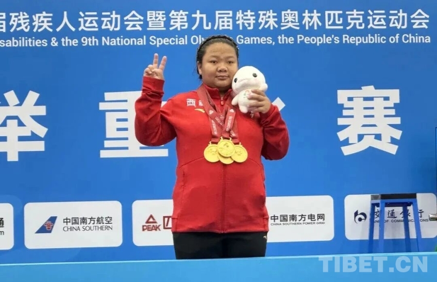 图为特奥举重女子90公斤级以上决赛中,运动员曲尼格桑夺得4枚金牌