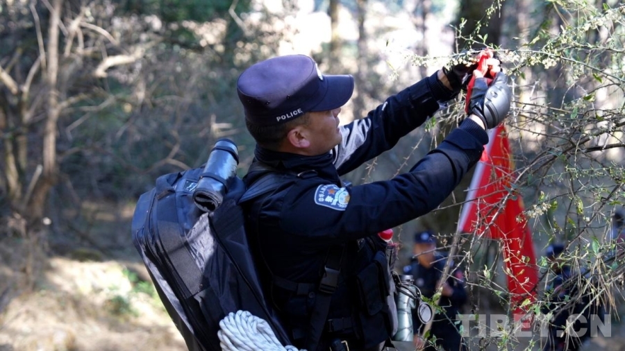 这一路,所谓好走的路,也只够一人挺直身子通过。更多时候,我们必须手脚并用——脚下是打滑的碎石。手紧抓着岩缝里的草石,一步,一步,往前挪。巡边途中的原始丛林间,无数或新或旧的红绳系于冷杉枝头,蜿蜒指向中尼边境46号界桩的方向——这是民警们用脚步反复确认的“生命航线”。