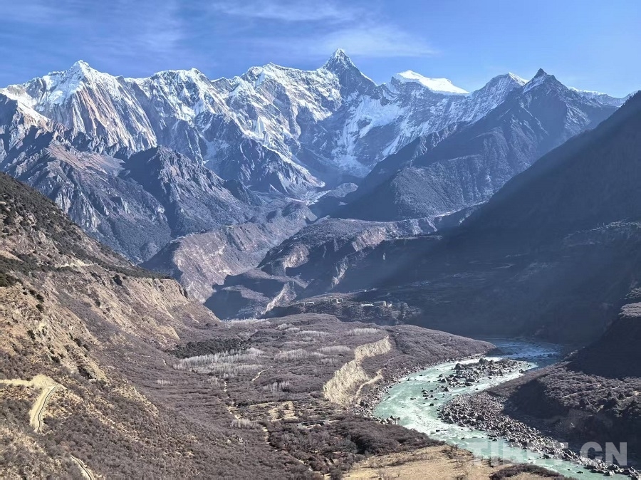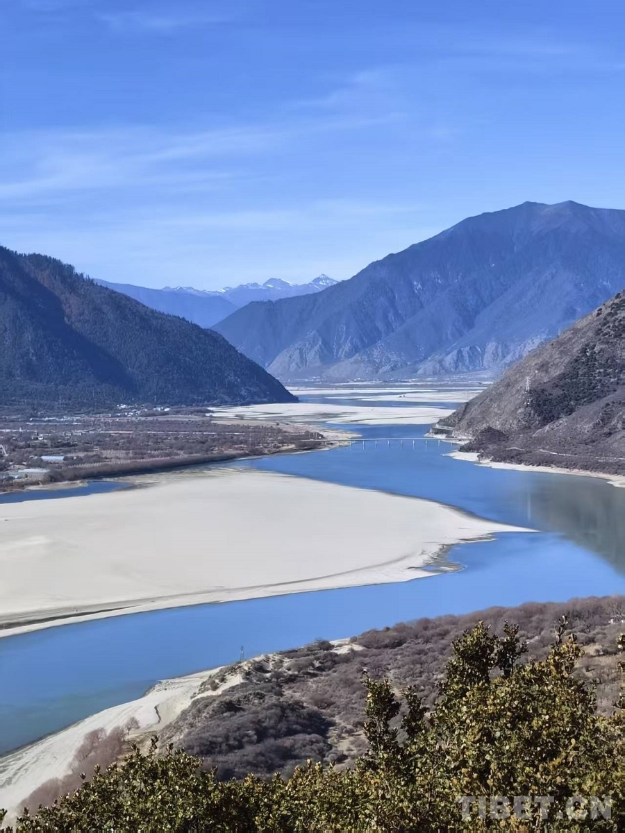 冬日,雅鲁藏布大峡谷静默如诗。江水凝为碧蓝玉带,蜿蜒穿行山间。驱车沿山路前行,掠过田舍与松林,蓦然抬首,巍峨雪山扑面而来——阳光璀璨,峰巅银光灼灼,在蔚蓝天空下愈显玉洁冰清。