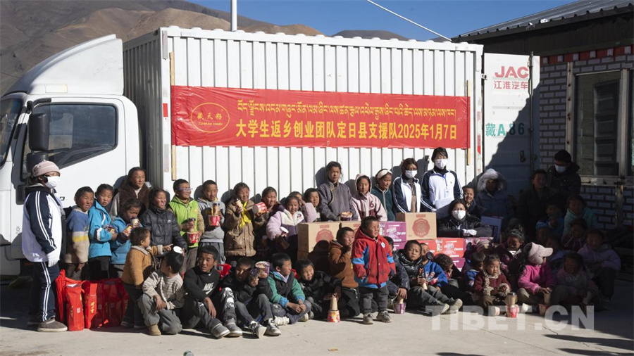图为拉萨市当雄县乌玛塘乡巴嘎村“00后”返乡创业大学生自发赴定日县捐赠物资(摄于2025年1月8日) 摄影:赵振宇