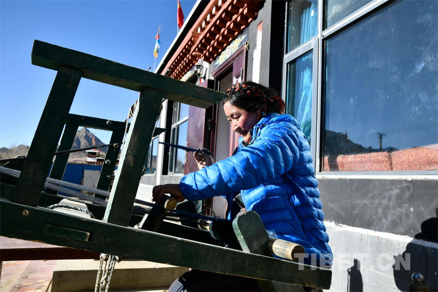 图为定日县协格尔镇奶色姆村的次仁拉宗在新居前笑容灿烂地纺织毛线(摄于2026年1月5日)摄影:赵振宇