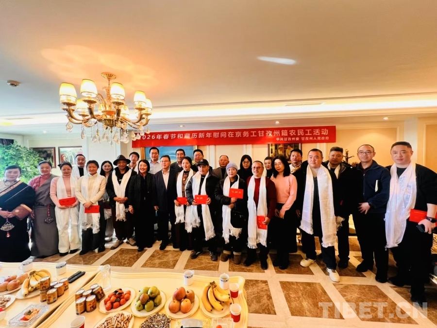 图为2026年春节和藏历新年慰问在京务工甘孜州籍农民工活动现场合影 摄影:龙真多吉