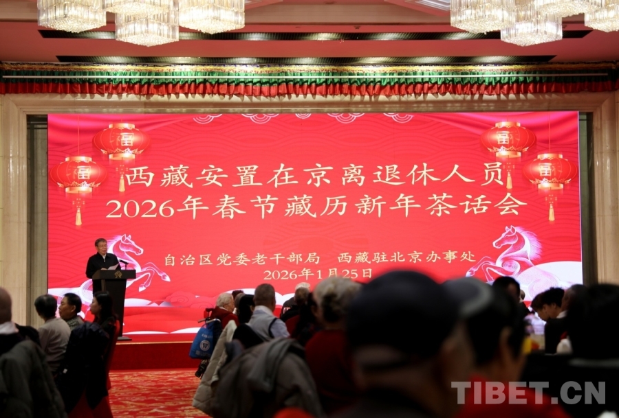中国西藏网讯 时值春节、藏历新年临近,1月25日,北京西藏大厦里暖意融融,欢声笑语,由西藏自治区党委老干部局、自治区政府驻北京办事处共同主办的西藏自治区安置在京离退休人员2026年春节藏历新年茶话会在这里举行,100余位曾在西藏工作生活多年的“老西藏”欢聚一堂,共话西藏情。