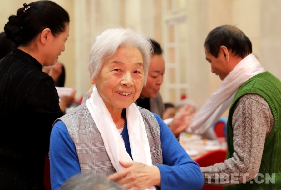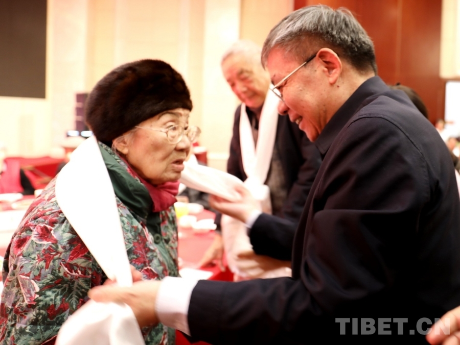 图为在西藏自治区安置在京离退休人员2026年春节藏历新年茶话会上向“老西藏”们敬献哈达 摄影:刘莉