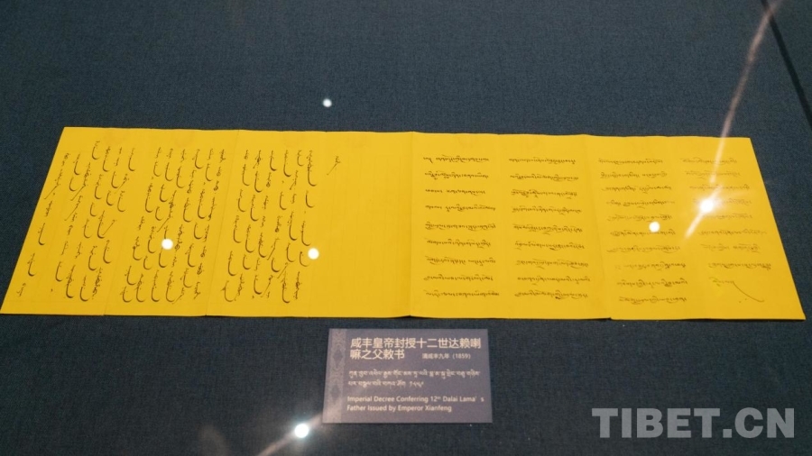 图为西藏博物馆藏咸丰皇帝封授十二世达赖喇嘛之父敕书(清咸丰9年 公元1859年) 摄影:赵振宇