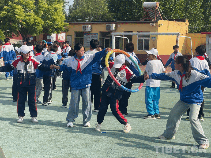 联谊会后,两地青少年移步操场,开启“聚力同行·主题运动会”。运动会采用混合组队方式,将西藏学生与聊城学生交叉分为5组,每组20人。“同心传递赛”——手拉手传递呼啦圈不松手;“携手运球大作战”——背对背夹气球接力;“集体跳绳接力”——摇绳跳绳依次完成;“同心协力拔河赛”——各组全员上阵,齐心协力。呐喊声、欢笑声此起彼伏。