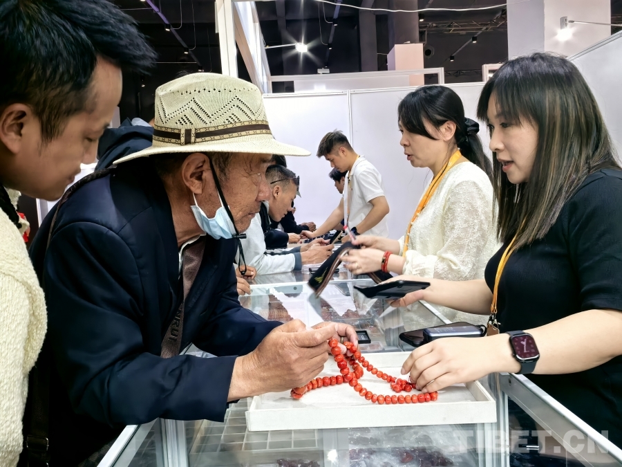 图为5月16日第二届拉萨进口商品展览会上,顾客在咨询珊瑚饰品价格 摄影:王淑