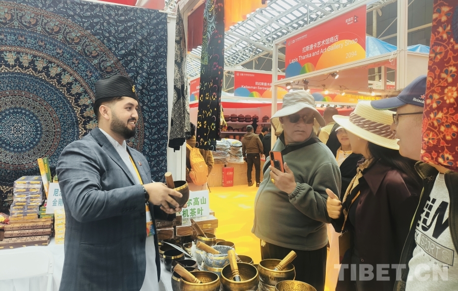图为5月16日,第二届拉萨进口商品展览会上,尼泊尔商人向顾客演示如何敲击颂钵 摄影:赵钊
