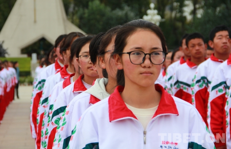 图为师生代表在布达拉宫广场上参加升国旗仪式 摄影:赵钊
